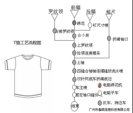 生产线平衡是生产管理的一项重要工作,直接影响到流氷线的综合效率,优秀的生产线要求同时达到以下几个目标:一,每一个工作站的工作任务所需时间应该保持尽量一致,最大限度减少员工因分工不均衡引起的等待浪费,二,按照工艺流程的顺序安排裁片在流水线上的流动,使裁片单向流动,尽量减少倒流带的浪费,三,每个工作站的员工都能被分配到自己最擅长的工序。要达到以上目标,上线之前,就要有详尽且合理的工艺流程设计方案。优秀的工艺流程设计在使成衣达到产品工艺要求与质量要求的同时,也使流水线达到更平衡更合理,从而使流水线的综合效率最大化。工艺流程作为生产过程管理的指导性文件,对成衣的标准化生产,工业化生产、智能化生产起着至关重要的作用,是服装企业实现现代化管理的不过缺少的重要数据。为了更好地表达服装的加工工艺流程,行业一般采用流程图方式对款式的工艺流程进行描述,通过特定的图示来表达流程中的各种加工工序,再通过箭头方式将流程顺序表示出来,清晰明了地表达工艺流程中各部分的结构以及工艺的生产过程,就形成了工艺流程图,如下图,就是T恤的生产工艺流程图: